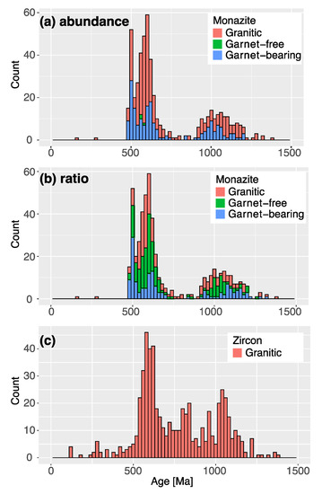 A comparison between the age spectra for detrital monazite and zircon independently provides insight into the origins of the detrital monazites (Figure 5). The detrital zircons from the same African rivers were analyzed for U–Pb age [34]. Since the analyzed zircon grains had oscillatory or sector zoning in cathodoluminescence images, the zircon age spectrum (Figure 5c) should reflect igneous rather than metamorphic events. A large age peak at 500–480 Ma is defined by the detrital monazite (Figure 5a,b), whereas the detrital zircon does not show a clear peak at this age (Figure 5c). The difference indicates that the monazite age peak at 500–480 Ma reflects metamorphic events. This view is highly compatible with the results of the ratio-based discrimination, which indicated that the 500–480 Ma monazite population was dominated by grains of metamorphic origin (Figure 5b). By contrast, this view is difficult to reconcile with those of the abundance-based discrimination, which indicated nearly equal proportions of the grains of granitic and metamorphic origin (Figure 5a). Accordingly, we consider that the results from the ratio-based approach were more reliable than those that were obtained by the abundance-based approach.