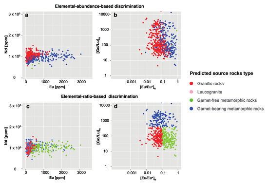 Comparison of source rock types predicted by (a,b) elemental-abundance-based discrimination and (c,d) elemental-ratio-based discrimination. (a,c) Plot of Nd versus Eu and (b,d) plot of [Gd/Lu]N versus [Eu/Eu*]N.