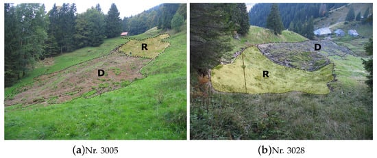 Release area (R) and deposition zone (D) of two of the documented hillslope debris-flow events used for this study [42]. A transition area is not clearly identifiable. Both events occurred in 2005 in Entlebuch (Canton of Lucerne, Switzerland).