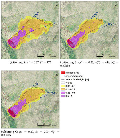 Simulations based on fixed and values and only calibrating the yield stress of the flow —settings B and C—showed 10% and 8% less overestimation of the observed depositional area, respectively. Visually this performance improvement can be seen in Figure 5.