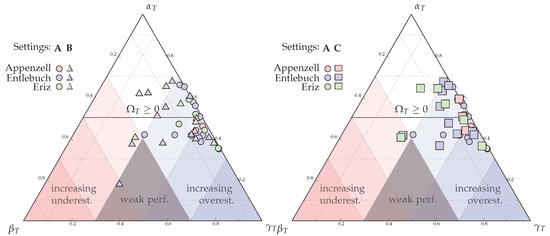 To quantify the accordance between simulated and observed deposition area, we used the evaluation concept proposed by Heiser et al. [43]. This concept enables an objective comparison and visualisation of model performance across platforms that is independent of process type. The proposed method is based on the comparison of normalised partial observed and simulated areas of deposition (Figure 2), which can be plotted in a ternary diagram to visualise the degree of over- and underestimation. Results are summarised in the single value :