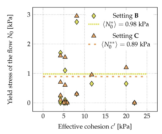 One might further hypothesise that different saturation conditions, which affect shear strength in the soil, might potentially also affect cohesive interaction of the bulk mixture at low shear rates. Our results, however, indicate that the pre-saturation of the soil does not play a significant role for the simulation of the compiled hillslope debris-flow events with RAMMS DF, because we could not detect any clear differences in the simulation performance between the field sites. Further, the yield stress of the flow does not correlate with the effective cohesion , i.e., the shear stress independent of the normal stress—typically also denoted as yield stress in soil mechanics (Figure 6).