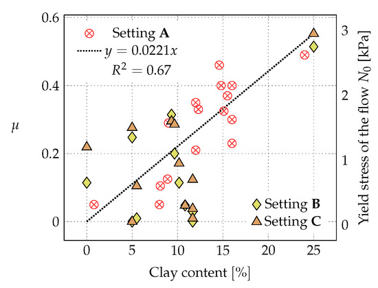 On the other hand, the back-calculated dry Coulomb friction values show a substantially clear correlation with the percentage clay content in the soil (Figure 7). The same trend can be observed for the yield stress of the flow values and . These findings support the results of Hürlimann et al. [1]. They observed that the clay content strongly influenced the runout distance and the affected area of experimental hillslope debris flows in the laboratory.