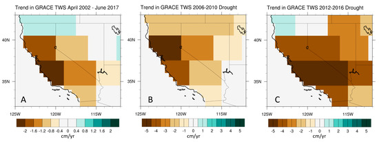 Trends in TWS observed by the GRACE satellites for (A) the entire time period of the study, (B) the drought period from 2006 to 2010, and (C) the drought period from 2012 to 2016.