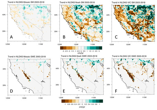 Trends in soil moisture (SM) and snow water equivalent (SWE) simulated by the NLDAS suite of models. (A,D) The Mosaic model. (B,E) The Noah model. (C,F) The VIC model.
