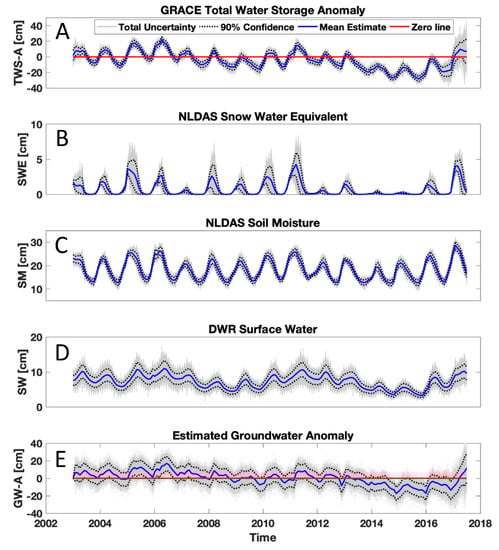 Each data product was re-gridded to match the GRACE product resolution (GRACE resolution = 0.50° × 0.50°). The original NLDAS simulations had a resolution = 0.125°, but these were re-gridded using bi-linear interpolation to match the gridding of the GRACE product. Once all products were on the same grid, we performed an area-weighted average that accounted for grid areas as a function of latitude. Then each of the data pieces was accumulated (summed) to obtain a temporal curve with uncertainties for each process (i.e., TWS(t), SM(t), and SWE(t)). The DWR reservoir data were in the form of point information, but we added up all these values to get one temporal data vector for California (i.e., SW(t)). Finally, once all the data was in the form of a temporal vector (with uncertainties), we were able to estimate the groundwater and its uncertainty.