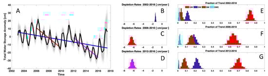 After applying the method described in Section 2.5, we are able to estimate the groundwater anomalies for the period of the study. Figure 3 shows the timeline of each hydrologic process, along with their respective uncertainty bounds. Table 1 reports the signal of water loss from each process, for different time periods. These numbers are also displayed in Figure 4, where the processes that contribute to the trends seen in TWS are disentangled and displayed separately. In summary, these results indicate that the majority of the loss in TWS is caused by groundwater depletion. This is especially apparent when we look at the volume of water lost in the right column of Table 1, where groundwater makes up the majority of this signal. Also, in Figure 4E−G, we show that groundwater makes up 60%−90% of the signal seen in TWS loss (red histograms).