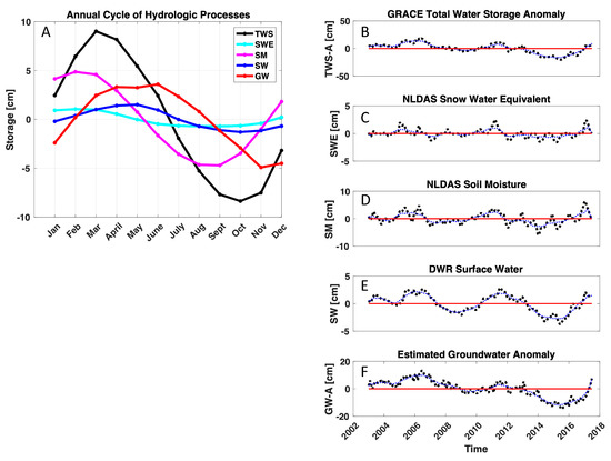In recent decades, the demands of fresh water for urban, agricultural, and environmental uses have exceeded the natural renewable supply in many regions of the world, especially for arid and semi-arid regions such as California [1,2]. To date, this gap between the available surface water supply and the growing water demand has caused significant stresses on fresh water systems globally. This has created a large reliance on groundwater, a slowly renewable resource conveniently stored at shallow subsurface aquifer layers. Because of continued extraction and insufficient recharge that is complicated by climate variability (i.e., droughts), depletion of subsurface aquifers has become a dire environmental consequence that is being observed globally in arid and semi-arid regions with highly variable precipitation (e.g., [3,4,5,6,7,8,9,10,11,12]). Generally, various aspects of the hydrologic cycle, such as snow pack and soil moisture, have been impacted by increasing temperatures and more variable precipitation. This overall shock to the water cycle can be seen in both observations and model simulations of total water storage for many regions of the world [7,8,9,10,11,12].