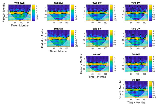 Many scientists have made use of the wavelet method in analyzing time series in geophysical or climate studies [39,40]. At present, there are many easy-to-use wavelet software packages for analyzing two time series together. Here, we used the cross wavelet transform and wavelet coherence (i.e., https://www.mathworks.com/matlabcentral/fileexchange/47985-cross-wavelet-and-wavelet-coherence) for examining relationships in the time frequency domain between two time series [40]. Grinstead et al. demonstrated how phase angle statistics can be used to gain confidence in causal relationships and test mechanistic models of physical relationships between time series. As hypothesized, the annual and year-to-year dynamics of the hydrologic cycle should portray a clear cascading effect. To investigate this further, we applied a wavelet analysis, which shows the frequency (in months) with which there is a clear signature between the temporal correlation of two processes. We applied this test to show the wavelet analysis results for each pair of processes estimated in our study.