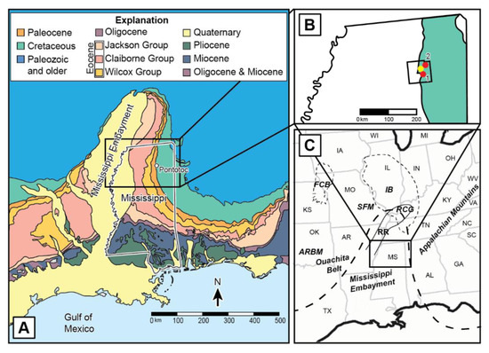 Cretaceous outcrops, basin locations, and structural maps of the Mississippi Embayment and central United States. (A) Mississippi Embayment outcrops with the location of Pontotoc County, MS (modified from Reed et al. [7]). (B) Locations of (1) southern sample location dots and (2) northern sample location are marked by red dots while the previously mined bentonite location is marked by a yellow dot. (C) Basin and structures of the central and eastern United States. ARBM—Arbuckle Mountains; FCB—Forest City Basin; IB—Illinois Basin; RCG—Rough Creek Graben; RR—Reelfoot Rift.