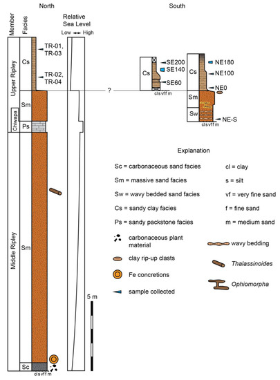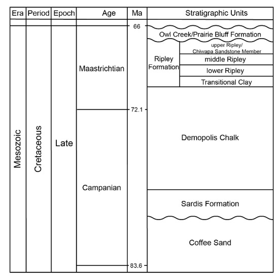 - Skotnicki, M.C.; King, D.T. Depositional facies and eustatic effects in Upper Cretaceous (Maastrichtian) Ripley Formation, central and eastern Alabama. Trans. Gulf Coast Assoc. Geol. Soc. 1989, 39. [Google Scholar] [CrossRef]