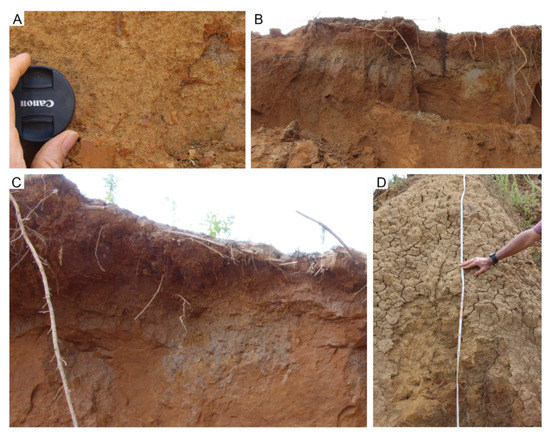 Very thickly bedded (180–385 cm), massive, poorly sorted, sandy gray to red clay with matrix-supported, very fine to coarse, but dominantly medium-sand-sized, subangular to subrounded quartz grains with rare very-fine-sand-sized muscovite grains and local concentrations of clay, some as mm-scale diameter spherical aggregates that spall out of freshly exposed surfaces (Figure 4 and Figure 5A). Beds fine upward to silty clay and contain somewhat laterally extensive (traceable for tens of meters) lenses of less sandy gray clay with irregular boundaries, as if disrupted by bioturbation (Figure 4 and Figure 5B,C). This lithofacies weathers to sloped surfaces with polygonal desiccation cracked patterns when dry (Figure 4 and Figure 5D), which led us to hypothesize that this lithofacies contained expansive clays. The upper ~145 cm of the beds show angular blocky and wedge ped structure, black ped coatings, and abundant grass roots, representing recent soil development at the modern surface. Spherical clay aggregates are found below the zone of soil development.