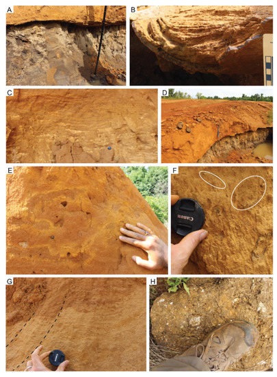 Thick bedded (up to 50 cm), friable, ripple-laminated, light brown, poorly sorted, fine-to-medium, subrounded to subangular quartz sand (Figure 4 and Figure 6G). Ripple lamination is subtle and difficult to see without proper lighting. Ripples are asymmetrical, but postdepositional slumping and microfaulting make it difficult to determine current direction. This lithofacies grades upward into the sandy clay lithofacies and grades laterally into the wavy-bedded sand lithofacies. No fossils were observed.