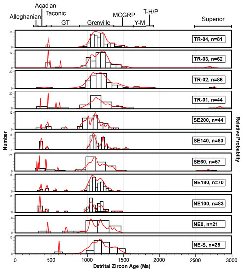Sample TR-02. U–Pb zircon analyses (n = 86) for this sample range in age from 2762 Ma to 354 Ma. The PDP for sample TR-02 has a dominant double peak at ~1086 Ma and ~1188 Ma along with two peaks at ~449 Ma (Taconic) and ~2754 Ma (Superior) (Figure 8).