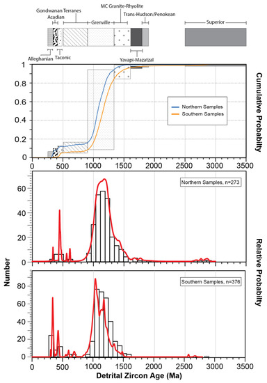 The combined northern samples are dominantly Grenville in age (80.2%, n = 219). The next highest percentage of analyses is the MCGRP at 9.9% (n = 27) of the analyses. The remainder of the analyses in descending order are: Taconic (3.3%, n = 9), Acadian (1.8%, n = 5), Superior (1.5%, n = 4), Yavapai–Mazatzal (1.5%, n = 4), Gondwanan Terranes (1.1%, n = 3), and Trans-Hudson/Penokean (0.7%, n = 2) (Figure 10). There were no analyses that were of Alleghanian age (Table 1; Figure 9).