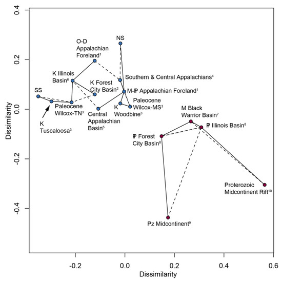 MDS plot representing the dissimilarities between Pontotoc samples and published DZ datasets, solid lines represent pairs of samples with the lowest dissimilarity, dashed lines represent pairs of samples with the second lowest dissimilarity. Please note that sample plot in two groups color coded with blue dots and red dots. SS: Southern sample; NS: Northern sample; O-D Appalachian Foreland: Ordovician and Devonian strata 1 [50]; M–P Appalachian Foreland: Mississippian–Permian strata 1 [50]; K Forest City Basin: Cenomanian–Albian Dakota Fm 2 [17]; Paleocene Wilcox-TN: strata from Tennessee 3 [1]; Paleocene Wilcox-MS: strata from Mississippi 3 [1]; K Tuscaloosa: Cenomanian Sandstone 3 [1]; K Woodbine: Cenomanian Fm 3 [1]; Southern and Central Appalachians: Paleozoic to Mesozoic strata 4 [48]; Central Appalachian Basin: Paleozoic to Mesozoic strata 5 [49]; K Illinois Basin: Cretaceous strata 6 [3]; M Black Warrior Basin: Mississippian to Pennsylvanian strata 7 [46,47]; P Illinois Basin: Pennsylvanian 8 [45]; P Forest City Basin 8 [45]; Pz Mid-Continent: Cambrian to Ordovician strata 9 [44]; Proterozoic Mid-Continent Rift: 10 [43].