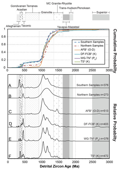 The K–S statistical analysis of the seven samples from the southern Pontotoc site yielded p-values > 0.05 (~0.06–1.0), thus, we accept the null hypothesis that the DZ age spectra are from the same population. The K–S analysis of the four samples from northern Pontotoc likewise yielded p-values > 0.05 (~0.6–1.0) that indicated that the DZ age spectra are statistically similar. Due to the statistical similarity, the seven southern samples were combined into one southern sample (SS) and the four northern samples were combined into one northern sample (NS). These DZ spectra were then compared to each other with a K–S test, which yielded a p-value of ~0.0000041 indicating that the two datasets are not statistically similar to one another. The K–S statistical analysis of the detrital age spectra for the NS and the Albian–Cenomanian Dakota Fm of Finzel [17] and the Ordovician to Devonian strata of the Appalachian Foreland Basin (AFB) of Thomas et al. [50] are statistically similar (p = 0.09 and 0.05 respectively). The SS was found to be statistically similar (p = 0.66 and 0.16 respectively) to the Cenomanian Tuscaloosa Fm and the Paleocene Wilcox in Tennessee of Blum and Pecha [1]. Both the NS and SS are statistically distinct from all other Precambrian and Paleozoic strata in the mid-continent [43,44], the other Paleozoic sandstones in the Illinois and FCB [45], the Paleozoic Black Warrior Basin strata [46,47], the Cenomanian Woodbine sandstone [1], and the Paleocene Wilcox Group in Mississippi [1].