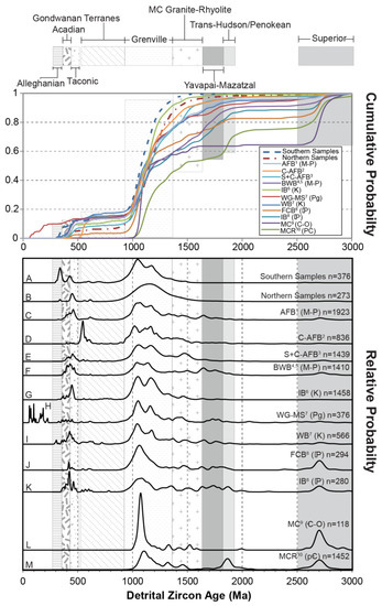 - Dickinson, W.R.; Gehrels, G.E. U-Pb ages of detrital zircons in Jurassic eolian and associated sandstones of the Colorado Plateau: Evidence for transcontinental dispersal and intraregional recycling of sediment. Geol. Soc. Am. Bull. 2009, 121, 408–433. [Google Scholar] [CrossRef]