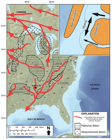 Sediment began accumulating in the Reelfoot Rift basin following early Cambrian rifting, and subsidence roughly kept pace with sedimentation from the late Cambrian to Middle Ordovician [13,14,15]. From the Middle Ordovician through the Early Cretaceous, terrigenous input waned, allowing carbonate deposition to dominate until the assembly of Pangaea [1,16,17]. During the late Paleozoic, uplift and erosion resulted in an unconformity above upper Paleozoic strata [10]. By the Early Cretaceous, drainage systems extended from the Appalachians to the eastern shoreline of the western interior basin [1,17]. During the Cenozoic, renewed subsidence rerouted terrigenous sediment into the MSE, ultimately resulting in a succession of Mesozoic and Cenozoic rocks and sediments up to 5500 m thick [4].