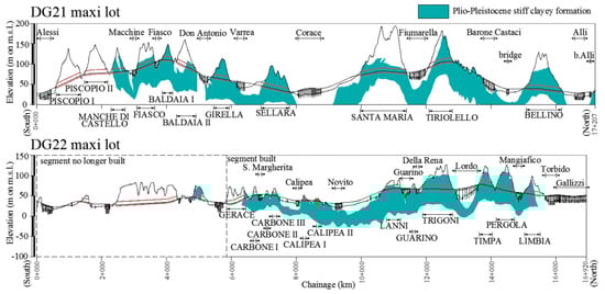 The most important engineering works for the DG21 mega lot include 11 twin-tube tunnels with total length of 7.9 km, 10 viaducts, 2 bridges, and 7 junctions; for the built segment of the DG22 mega lot, 5 twin-tube tunnels (total length 2.6 km), 7 “cut and cover” twin-tube tunnels, 7 viaducts and 3 junctions. Such works are outlined in Figure 2 through simplified longitudinal cross-sections, with indication of viaducts, bridges, and tunnels for the DG21 and DG22 segments, respectively. In the figure, the diffusion of Plio-Pleistocene clayey formation is highlighted in color.