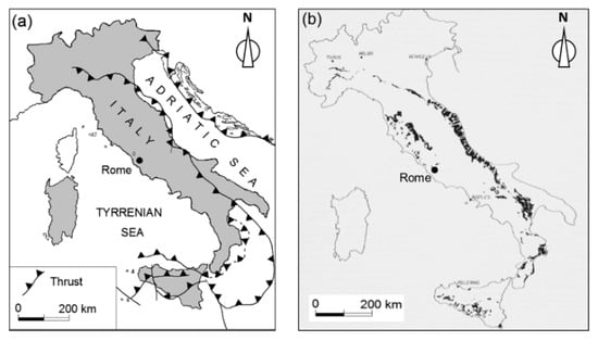 (a) Schematic structural map of Italy showing the current location of the Apennines accretionary wedge front (modified from Loreto et al. 2015 []); (b) Outcrops of Plio-Pleistocene marine clayey formation in Italy (modified from Manfredini et al. 1985 []).