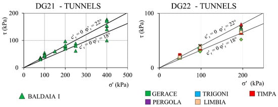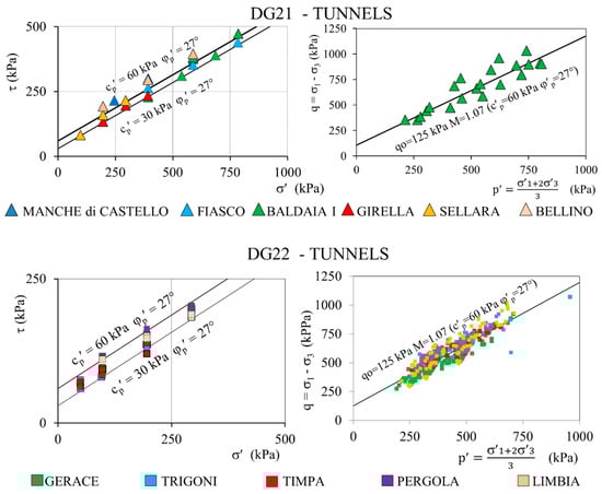 The Plio-Pleistocene formations of the DG21 and DG22 maxi lots exhibit very similar geotechnical properties: in both cases, a grading with 40–50% of clay, 40–50% of silt, and 0–10% of sand was found; liquid limit ranges between 50 and 75 and Plasticity Index between 25 and 40, so that the soil classifies as high plastic clay (CH) or silt (MH), according to the Casagrande classification chart. Direct shear and triaxial compression tests, represented through Mohr-Coulomb and stress invariants envelopes, respectively, indicate that a linear effective strength envelope can be adopted with peak friction angle of φ′p = 27° and effective cohesion c′p = 30–80 kPa (Figure 4). Both pressuremeter and cone penetration tests indicate that the undrained shear strength (cu) may vary between 200 and 400 kPa, although much higher values, up to 700 kPa, were occasionally found.