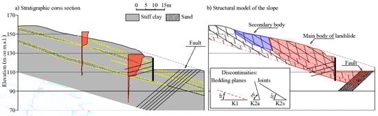 In Figure 6a, a schematic representation of the cross-section of the slope in the area of the southern portal is shown with the most significative inclinometer profiles and the typical arrangement of the Plio-Pleistocene formation with the sandy layers sometimes included. The bedding planes are approximately parallel to the sloping angle, that is equal to 18°. At the toe of the slope a fault was detected dipping towards the slope itself. The fault had deformed and altered the geological setting in the area. In Figure 6b, a simplified scheme of the structural model of the slope is given to bring to attention the two soil bodies involved in the instability. It can be observed that the displacement of the soil mass, evidenced by the inclinometers, takes place along the bedding planes.