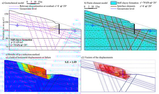 Since it is clear that the kinematics of soil movements in stiff jointed formations is strongly conditioned by the geometry of the excavation, size and orientation of the cut surfaces in relation to the structural setting of the deposit, the amount of confinement exerted by the existing stresses, and the reduction of interlocking between soil blocks due to stress relief, the main design strategy should aim firstly at including the pattern of discontinuities in the geotechnical model. The definition of a reliable geotechnical model, in these cases, is essential, but not straightforward. For this reason, the comparison of the numerical results with sounding data from monitoring (i.e., data characterized by redundancy and coherence, see []) appears to be the main strategy to assess the reliability of any geotechnical model, including complex formations. When the geotechnical model is a reliable representation of the reality, the dimensioning of the engineering structures can be appropriate and safe as well as the result of slope stability analyses.