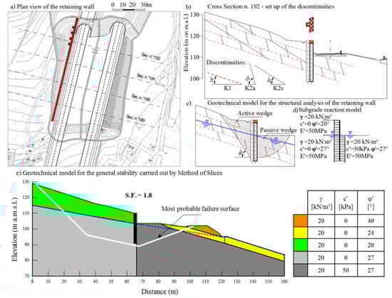 (a) Plan view of the area of interest with the position of the retaining wall; (b) cross-section n. 192 with the pattern of the main families of discontinuities; (c) geotechnical model for the structural analysis of the retaining wall (compare the pattern of discontinuities with active and passive wedge); (d) subgrade reaction model used to design the retaining wall (note the different strength parameters adopted to take into account the discontinuities); (e) geotechnical model adopted for general stability of the retaining wall.
