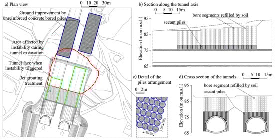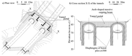 Figure 10a shows a plan of the Timpa southern entrance, where it is possible to distinguish the bored piles of the tunnel portal from those built for the foundation of the massive capping beam. In Figure 10b, a cross-section of the tunnels with highlighted components of the portals (diaphragms of bored piles ø1500 and arch-shaped massive capping beam) is shown. It is evident from the figure that this solution allows to reduce the span of the excavation at the tunnel entrance from about 15 m to 5 m.