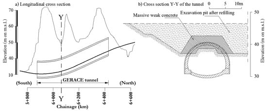 (a) Longitudinal cross-section of the Gerace tunnel; (b) Cross-section Y-Y of the tunnel.