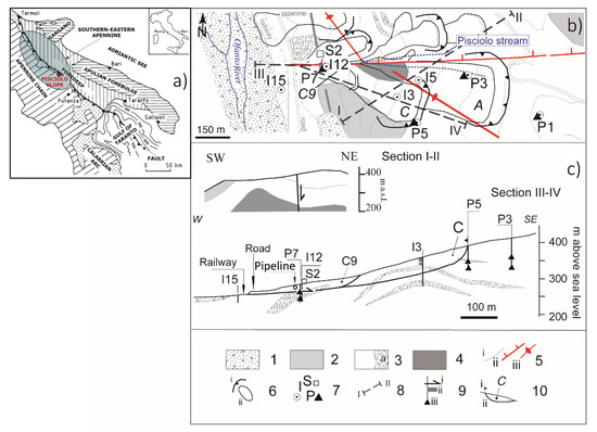 (a) Geological map of the Southern Italy, together with both the limited grey area representing the Southern-Eastern Apennine and the location of the Pisciolo slope. Geological map (b) and sections (c) of the Pisciolo slope (adapted from [3]); section I‒II is the geological section, whereas section III‒IV is the geotechnical one, whose traces are reported; Key: 1) debris and alluvial deposits; 2) N sandstones; 3) PD clays (a; fractured rock strata), 4) R clays; 5) stratigraphic contact (i), fault (ii) and anticline axis (iii); 6) landslide crown (i) and body (ii); 7) borehole with piezometers (P), or with inclinometer (I), GPS sensor (S2); 8) line of section; 9) inclinometer shear bending (i), disturbed soil (ii) and piezometer cell (iii); 10) labelled landslide—crown (i) and slip surface (ii) (Cotecchia et al. 2019).