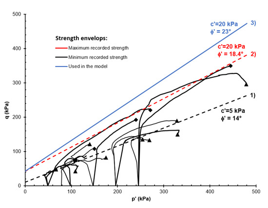At the same time, though, as is well known, the Mohr‒Coulomb model underestimates the volumetric straining of the clay when saturated and isotropically compressed to [71], since the model solely implements the yielding in shearing. Also, the model does not simulate the clay strain softening in shearing. Such model features are expected to underestimate the progression of yielding and failure in the slope.