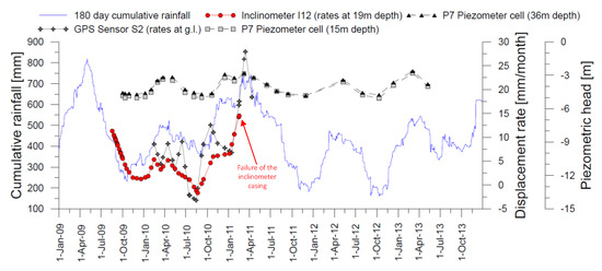 The displacement rates monitored along this shear band (inclinometric measurements) and those monitored at the ground surface (through the GPS sensor S2, Figure 1b,c), are reported in Figure 3, together with the piezometric levels recorded over time by means of the piezometers at 15 m (i.e., electric piezometer) and 36 m (i.e., Casagrande piezometer) depths down borehole P7 (Figure 1b,c). The concurring fluctuations of the piezometric levels and of the displacement rates, shown in Figure 3, match a seasonal (180-day period) trend. The maximum values of the piezometric head and of the displacement rates occur at the end of winter or early spring, whereas the minimum values correspond to the end of summer. The piezometric fluctuations concur with the 180-day cumulative rainfalls, also shown in the figure [3,27,53].