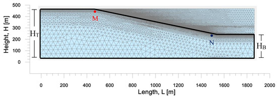 Figure 4 reports the FE mesh of the slope model. Between the base and the top horizontal ground levels, the numerical model has been set to have a constant slope, selected to be about the average of slopes found to be location of climate-induced landslide activity in the Southern-Eastern Apennines (12°; e.g., section III‒IV in Figure 1c). The mesh includes 136,101 nodes in 16,918 15-node triangular elements, each having nine stress points. The total model extension, L, is 1850 m, whereas its height is 425 m upslope, HT, and 200 m downslope, HB (Figure 4), after the slope initialization.
