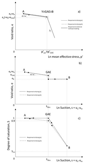 Schematic outline of the response of overconsolidated clays to free drying, according to the framework proposed by Cafaro and Cotecchia [69]: (a) void ratio—mean effective stress path of the clay under either isotropic compression, or free-drying; (b,c) Cafaro and Cotecchia [69] model. The dashed line represents the response to external loading; the continuous thin line represents the response to drying when S = 1 for s < sdes; the dash and dot line represents the response to drying when 0.9 < S < 1 for s < sdes.