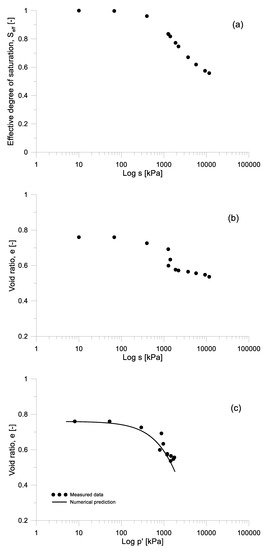 Summarizing, according to the framework, for s < S can drop to a limited extent, not below 0.9, and the function must provide p’ values consistent with the prediction of a clay straining along the path A-GAE in Figure 5a, controlled by the pre-yield compressibility. For s about there is an immediate limited volumetric collapse and for >, S < 0.9 and the function must provide values allowing for the prediction of zero volumetric strain increments. Therefore, in the present modelling the calibration in free drying has complied with the following conditions: (i) for s ≤ , and corresponding p’ ≤ , the prediction of void ratio variations controlled by the parameters E’ and ν’ (Table 1), i.e., by a linear elastic compression law; (ii) for s > , the prediction of zero increase in , keeping p’ = ; (iii) the assumption of = = 980 kPa, as measured for the Pisciolo clays. The value of achieved through the calibration was .