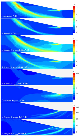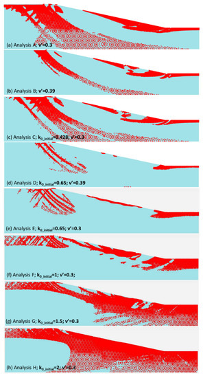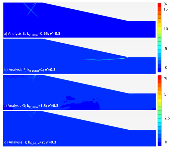 However, only for k0_initial = 1 (i.e., analysis F), the shear band appears to acquire a morphology compatible with the progressive development of a deep roto-translational sliding mechanism. For k0_initial >1, instead, the shear band tends to deepen towards the bedrock of the slope model (Figure 9g,h). Moreover, the bigger the k0_initial, the higher the deepening of the shear band. The deepening of the shear bands has been previously observed by Potts et al. [74], although when using a strain softening Mohr‒Coulomb model.