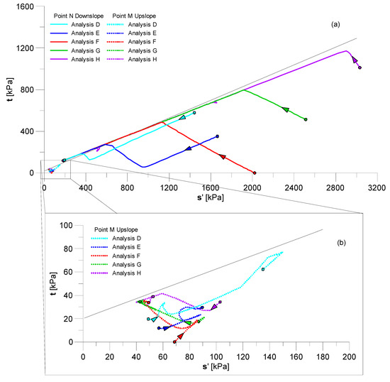 In Figure 10 the stress paths during the excavation process for all the analyses implementing = 0.3 are reported for two points in the slope, M and N in Figure 4. In particular, Figure 10a reports all the stress paths for both stress points, M upslope and N downslope. The stress paths for the stress point M are also zoomed in Figure 10b. For k0_initial >0.65 (i.e., analyses F, G and H), the stress paths at N follow similar trends. They are all characterized by an initial increase in deviatoric stress associated with a decrease in mean normal effective stress, which corresponds to a first stage of the valley excavation. After the stress paths approach the yield envelope, they move along it, during the unloading, while remaining at yield. It is worth clarifying that the stress paths in Figure 10 seem not to join the yield envelope, but rather follow lines at a small distance from it, merely due to a numerical tolerance adopted in the calculation, since point N in Figure 4 is predicted always to reach yield. Furthermore, the analysis predicts that the onset of yielding at N delays with reducing k0_initial.