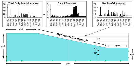 After the initialization stage, the hydraulic condition along the sloping portion of the model top boundary was changed from a hydraulic head condition to an infiltration condition, in order to run the SLVA interaction (Figure 11). In particular, the 365 days of net rainfall computed for the climatic year 2006–2007 were input 10 times. The net rainfall was determined as difference between the total daily rainfall and the daily evapotranspiration (Figure 11), from 1 September 2006 to 31 August 2007. The evapotranspiration rate was computed by means of the FAO Penman‒Monteith method [18] using the same procedure, input data and parameter values, extensively reported by Cotecchia et al. [27]. Only a fraction of the net rainfall effectively infiltrates through the outcropping soil layer, since runoff may occur; the latter is computed automatically by the FE code switching the infiltration boundary condition at the ground surface into an hydraulic head condition when a user-input hydraulic head is reached.