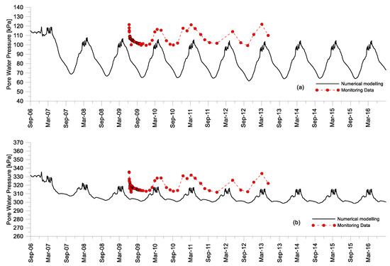 The pore water pressures predicted in the 10 years of analysis for the model points V and W in Figure 11, corresponding to the piezometers installed down the borehole P7 in Figure 2, are shown for the analysis F (k0_initial = 1) in Figure 12. Point V is at 15 m depth and point W at 36 m depth. The results of analysis F are very close to those achieved in all the other analyses initialized with the k0 procedure (C to H).