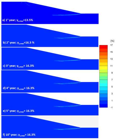 Analysis F: evolution of the progressive failure due to the SLVA interaction in terms of cumulated shear strain during the 10 years of net rainfall; the strain fields refer to the end of the first, second, third, fourth, fifth and 10th years. Figures from a) to f) correspond to the results at the end of the 1st, 2nd, 3rd, 4th, 5th, and 10th year of analysis.
