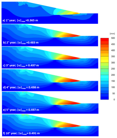 Analysis F: evolution of the progressive failure due to the SLVA interaction in terms of displacements during the 10 years of net rainfall; the total displacements refer to the end of the first, second, third, fourth, fifth and 10th years. Figures from a) to f) correspond to the results at the end of the 1st, 2nd, 3rd, 4th, 5th, and 10th year of analysis.