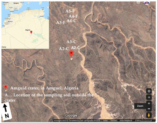 Soil samples from four different small-sized deposits located at various distances from the crater were collected. The approximate distances from the Amguid structure and geographic coordinates of the collection points are reported in Table 1, and Figure 1 and Figure 2.