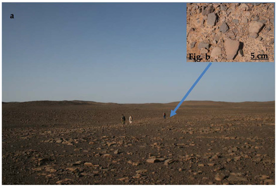 Thus, we decided to concentrate our attention on the search for impact evidence by considering the loose sedimentary materials (soil) that were based on geological grounds. Field morphological observations should be regarded as a more appropriate method for detecting evidences of impact events in terms of products (e.g., vitreous particles), or of remnants of the extraterrestrial projectile. Field observations on the Amguid area show that, where Devonian bedrock is not directly exposed, a regolith cover formed of a veneer of boulders, blocks and rock debris containing minor grain-sized components, is commonly present (Figure 2 and Figure 3a,b).