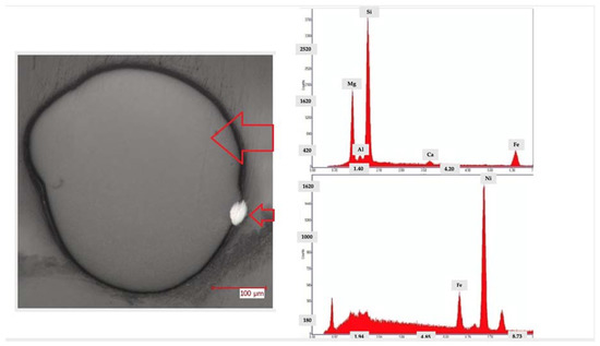 Figure 5 reports the results of such analysis on a sample from soils collected near the rim of the crater. It consists of a single transparent almost spherical particle associated with a minor grain of opaque phases. SEM-EDS analysis suggests a transparent component of an Al-low ferromagnesian silicate olivine-compatible composition and the blank fragment of an Ni-rich metallic iron.