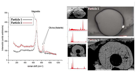 To get more in-depth mineralogical information about the nature of these particles, some of them were investigated by micro-Raman spectroscopy. The spectra (Figure 6, Caporali, personal communication) evidenced the presence of skeletal crystals of iron oxides (magnetite and possibly ilmenite) immersed in a ferromagnesian silicate component of probable forsteritic olivine composition. The morphology of the oxide crystals suggests that they are rapidly grown in an almost certain melted silicate matrix (Figure 5 and Figure 6).