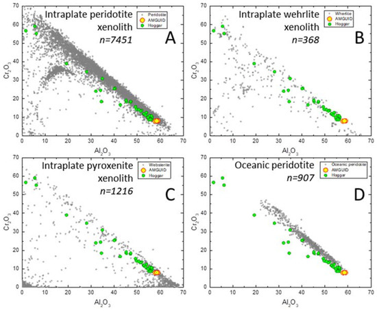 Chrome vs. aluminium variability of spinels from the Amguid area compared to other terrestrial sources. Amguid spinel composition is represented as yellow large circles (orange rim). The composition of ultramafics from the Hoggar volcanic field are plotted as green circles. Reference data fields are plotted as grey circles relative to: (A) Intraplate peridotite xenoliths; (B) Intraplate wherlite xenoliths; (C) Intraplate pyroxenite xenoliths and (D) Oceanic abyssal peridotites. Data for (A–C) are from the Geochemistry of Rocks of the Oceans and Continents (GEOROC) database (http://georoc.mpch-mainz.gwdg.de). Data for (D) are from the Petrological Database of the Ocean Floor (PetDB) (w.w.w.earthchem.org/petdb).