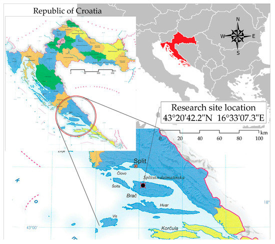 The main purpose of all undertaken explorations was to evaluate the location’s acceptability for future exploitation of the architectural structural stone, in the manner of extraction of dimension stones [1]. The research site is located in the Republic of Croatia, on the island of Brač, the largest island of central Dalmatia. The area spans over 3 hectares, the terrain elevation is 320 m above sea level, and the closest inhabited place, Donji Humac, is approximately 660 m northwest from the site. The geographical location of the research site is shown in Figure 1. To consider rock mass interesting from the point of view of extracting a dimension stone, a large supply of mass with similar texture and color should be confirmed. From the economical perspective of dimension stone mining, the strength and deformation properties of the analyzed jointed mass are very important [2].