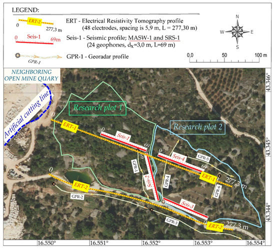 Investigation works comprise geological surveys and geophysical explorations. Geological prospection includes engineering geologic map creation at an appropriate scale, showing all the available geological elements [3], such as bedding planes, folds and shear zones as well as geological boundaries visible form the terrain surface. Deeper rock mass quality was assessed by geophysical profiling with a planned depth resolution of 20–30 m [4]. Altogether, four seismic profiles were recorded, Seis-1 to Seis-4, with dispositive lengths of 69 m, applying two seismic techniques, multichannel analysis of surface waves (MASW) (Vs) and shallow refraction seismic (SRS) (Vp), two electrical resistivity tomography (ERT) profiles, each 277.3 m in length, and six georadar (GPR) radargrams of 100 to 300 m in length. Westward, in the near vicinity of the investigated site, is an operational stone quarry. Stone blocks from the neighboring quarry vary in quality. For the purpose of this investigation, the terrain’s surface was partially cleared of vegetation so that the geophysical profiles could be laid down. In conclusion, the site’s suitability for mining applications was primarily based on the result of geophysical explorations distributed in profiles as in Figure 2. All named investigative works were done in October 2019.